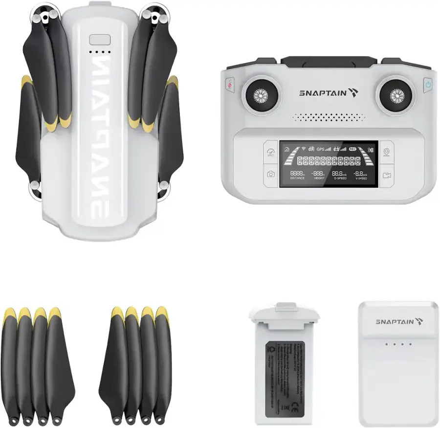 Snaptain P30 Pro Drone, Remote (built in battery), 1x 2000mAh Battery, 4 Spare propellers, USB Charging Cable, 1x Storage box, 4 Spare Screws (A*2/B*3), Screwdriver, User Manual, 1x Charging dock